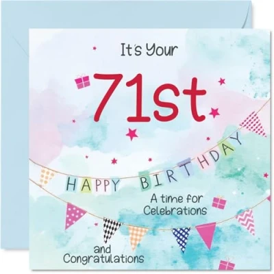 MAKE HIM SMILE WITH THIS UNIQUE BIRTHDAY CARD: This exceptional quality birthday card for him shows the design 'Its your 71st Happy Birthday A time for celebrations and congratulations'. If you are looking for special birthday greetings cards for Men birthday card then then this happy birthday card is bound to make him smile. Not just for birthday gifts for Men this could also be for Uncle, Husband, Dad, Great Uncle, Grandpa, Brother, Cousin or Grandad. WHAT DO YOU GET: The card is printed on one side and BLANK ON THE INSIDE to allow you to write your very own message. The unique fun design is printed on a specially sourced and environmentally responsible board. At 360 microns thick the natural white one-sided gloss board has a quality look and feel. Supplied with a coloured gummed envelope to complement the design and ready to be sealed and sent in the post. Great Uncle birthday cards, 71st birthday card, Husband birthday card. DESIGNED FOR WRITING: There is nothing worse than writing inside a card to find that the shiny surface makes the ink smudge. This is why we use a high quality one sided coated board. The uncoated side will absorb more of the ink from your pen to make smudging a thing of the past. 71st Birthday card for Dad, 71st Birthday card for Great Uncle, 71st Birthday card for Grandpa. SIZES: Greeting Card = 145mm x 145mm, Envelope = 155mm x 155mm, Card Thickness = 360 micron. Brother 71st birthday card, birthday cards for Cousin, cute birthday cards for Grandad, 71st birthday card Uncle, Husband 71st birthday card. MADE AND QUALITY CHECKED IN THE UK: We print and manufacture all our products right here in the UK so you can be sure of a fast turnaround and a product that is expertly made. Using environmentally responsible premium board our card is conscious of the responsible management of the world's forests - perfect birthday cards for Men, fun birthday cards for him, Husband 71st birthday cards, female birthday cards.