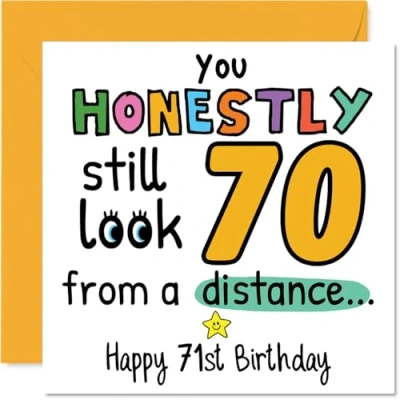 MAKE THEM SMILE WITH THIS UNIQUE BIRTHDAY CARD: This exceptional quality birthday card for him or her shows the design 'You Honestly still look 70 from a distance Happy 71st Birthday'. If you are looking for special birthday greetings cards for Men birthday card then then this happy birthday card is bound to make them smile. Not just for birthday gifts for Men this could also be for Auntie, Brother, Grandad, Uncle, Wife, Grandma, Nanny or Cousin. WHAT DO YOU GET: The card is printed on one side and BLANK ON THE INSIDE to allow you to write your very own message. The unique fun design is printed on a specially sourced and environmentally responsible board. At 360 microns thick the natural white one-sided gloss board has a quality look and feel. Supplied with a coloured gummed envelope to complement the design and ready to be sealed and sent in the post. Great Auntie birthday cards, Brother birthday card. NO INK SMUDGES: There is nothing worse than writing inside a card to find that the shiny surface makes the ink smudge. This is why we use a high quality one sided coated board. The uncoated side will absorb more of the ink from your pen to make smudging a thing of the past. 71st Birthday card for Grandad, 71st Birthday card for Uncle, 71st Birthday card for Wife. SIZES: Greeting Card = 145mm x 145mm, Envelope = 155mm x 155mm, Card Thickness = 360 micron. Grandma 71st birthday card, birthday cards for Nanny, special birthday cards for Cousin, 71st birthday card Auntie, Brother 71st birthday card. MADE AND QUALITY CHECKED IN THE UK: We print and manufacture all our products right here in the UK so you can be sure of a fast turnaround and a product that is expertly made. Using environmentally responsible premium board our card is conscious of the responsible management of the world's forests - perfect birthday cards for Men, fun birthday cards for him, Brother 71st birthday cards, female birthday cards.