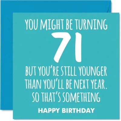 MAKE THEM SMILE WITH THIS UNIQUE BIRTHDAY CARD: This exceptional quality birthday card for him or her shows the design 'You might be turning 71 but youre still younger than youll be next year. So thats something HAPPY BIRTHDAY'. If you are looking for special birthday greetings cards for Men birthday card then this happy birthday card is bound to make them smile. Not just for birthday gifts for Men this could also be for Grandma, Cousin, Wife, Dad, Nanny, Nan, Sister or Grandad. WHAT DO YOU GET: The card is printed on one side and BLANK ON THE INSIDE to allow you to write your very own message. The unique fun design is printed on a specially sourced and environmentally responsible board. At 360 microns thick the natural white one-sided gloss board has a quality look and feel. Supplied with a coloured gummed envelope to complement the design and ready to be sealed and sent in the post. Great Grandma birthday cards, Cousin birthday card. NO INK SMUDGES: There is nothing worse than writing inside a card to find that the shiny surface makes the ink smudge. This is why we use a high quality one sided coated board. The uncoated side will absorb more of the ink from your pen to make smudging a thing of the past. 71st Birthday card for Wife, 71st Birthday card for Dad, 71st Birthday card for Nanny. SIZES: Greeting Card = 145mm x 145mm, Envelope = 155mm x 155mm, Card Thickness = 360 micron. Nan 71st birthday card, birthday cards for Sister, special birthday cards for Grandad, 71st birthday card Grandma, Cousin 71st birthday card. MADE AND QUALITY CHECKED IN THE UK: We print and manufacture all our products right here in the UK so you can be sure of a fast turnaround and a product that is expertly made. Using environmentally responsible premium board our card is conscious of the responsible management of the world's forests - perfect birthday cards for Men, fun birthday cards for him, Cousin 71st birthday cards, female birthday cards.