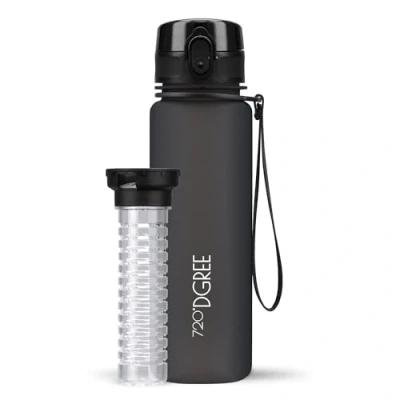 YOUR FINALLY HAPPY DRINKING BUDDY – Whether doing sports, outdoor activities, at your job, university, school, cycling or even at home, the "uberBottle" with 500 ml volume is always your perfect companion for all sweat-inducing and thirst-quenching activities. Or simply to drink enough during the day. Choose the right size for you from five sizes. Includes fruit basket. Thanks to the integrated scale, you always have your liquid supply in view, while the practical carrying strap makes it easier to transport. Leak-proof sports lid – this is equipped with a small ventilation opening and therefore allows a constant drinking jet without sucking or sipping. Together with the dust cap and the convenient one-hand opening at the touch of a button, this ensures an effortlessly hygienic drinking experience, ideal for on the go. At the same time, the integrated silicone seals and the locking bracket ensure that your drink always remains leak-proof in the bottle. Lightweight but robust – thanks to the robust and shock-resistant Tritan plastic, the "uberBottle" is lightweight, durable and shockproof, without risk of shards. In combination with compact dimensions, also perfect for children. Together with the low weight of 165 g and a volume of 500 ml, this makes it your ideal companion in any life situation and will support your active lifestyle. Dimensions: bottle diameter 6.6 cm, height 19.2 cm, lid height 4.3 cm, total height: 23.5 cm. Health and environment – free from BPA and other plasticisers, the "uberBottle" offers you an odourless and tasteless drinking experience. The wide opening (diameter 4.5 cm) allows for effortless cleaning as well as easy filling with ice, fruit, herbs or the 720°DGREE Infuuzed flavour together with the fruit infuser. With the "uberBottle" you avoid unnecessary disposable PET waste and make an active contribution to environmental protection. Guaranteed satisfaction – we are already convinced and would like to inspire you with the "uberBottle". In the 720°DGREE Store, you can find the simply delicious "InFuuzed" flavor alongside replaceable spare parts - when you want something more exciting than just water. Our German customer service will be happy to help you should there be problems. Add the "uberBottle" to your shopping cart now!