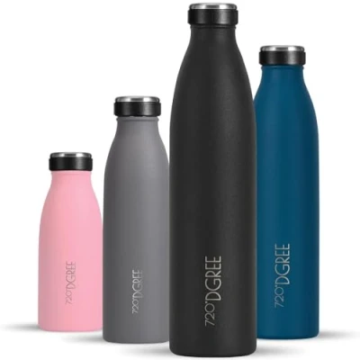 DOUBLE WALL PRECISION TECHNOLOGY - Thanks to its high precision, the most compact vacuum bottle in its class - up to 30% more compact. STYLISH AND DURABLE - The sleek, minimalist design meets 18/8 food grade stainless steel. With the use of stainless steel, the bottle is therefore ideal for juices and carbonated drinks. Dimensions: bottles Ø 6.8 cm, height 22.5 cm, total height with closure: 23.4 cm, drinking opening diameter 3.5 cm, weight: 284 g. PERFECT DESIGN: ONLY CONTACT WITH SILICONE AND STAINLESS STEEL - Compared to other stainless steel bottles, the cap on the bottom of the lid is also made of food grade stainless steel - For pure taste without toxins - BPA, BPS and phthalates free. Leak proof thanks to food safe silicone seal. THEREFORE, IT IS ALSO GREAT FOR CHILDREN KeepDGREE-TECHNOLOGY | 12H Hot / 24H Cold - Double-wall vacuum design at the highest level. With an extra layer of copper insulation - Always the IDEAL TEMPERATURE - throughout the day. GOOD FOR THE ENVIRONMENT - Long product life thanks to replaceable spare and wear parts such as lids and gaskets - The reusable milkyBottle actively contributes to reducing waste production of disposable bottles and helps you save money at the same time. To close the loop, the 720°DGREE bottle is fully recyclable. For maximum durability, we recommend cleaning by hand. 100% SATISFIED OR YOUR MONEY BACK: Your satisfaction is guaranteed. 720°DGREE stands for excellent customer service with thousands of happy customers. If you are not satisfied with the stainless steel thermal bottle, you just need to return it within 60 days, we will refund the full purchase price. To get your new high quality water bottle just click Add to Cart" now.
