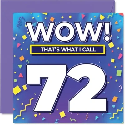 MAKE THEM SMILE WITH THIS UNIQUE BIRTHDAY CARD: This exceptional quality birthday card for him or her shows the design 'Wow! That?s What I Call 72'. If you are looking for special birthday greetings cards for Men birthday card then then this happy birthday card is bound to make them smile. Not just for birthday gifts for Men this could also be for Cousin, Wife, Dad, Nanny, Nan, Sister, Grandad or Uncle. WHAT DO YOU GET: The card is printed on one side and BLANK ON THE INSIDE to allow you to write your very own message. The unique fun design is printed on a specially sourced and environmentally responsible board. At 360 microns thick the natural white one-sided gloss board has a quality look and feel. Supplied with a coloured gummed envelope to complement the design and ready to be sealed and sent in the post. Great Cousin birthday cards, Wife birthday card. DESIGNED FOR WRITING: There is nothing worse than writing inside a card to find that the shiny surface makes the ink smudge. This is why we use a high quality one sided coated board. The uncoated side will absorb more of the ink from your pen to make smudging a thing of the past. 72nd Birthday card for Dad, 72nd Birthday card for Nanny, 72nd Birthday card for Nan. SIZES: Greeting Card = 145mm x 145mm, Envelope = 155mm x 155mm, Card Thickness = 360 micron. Sister 72nd birthday card, birthday cards for Grandad, special birthday cards for Uncle, 72nd birthday card Cousin, Wife 72nd birthday card. MADE AND QUALITY CHECKED IN THE UK: We print and manufacture all our products right here in the UK so you can be sure of a fast turnaround and a product that is expertly made. Using environmentally responsible premium board our card is conscious of the responsible management of the world's forests - perfect birthday cards for Men, fun birthday cards for him, Wife 72nd birthday cards, female birthday cards.