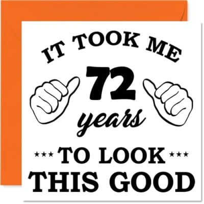 MAKE THEM SMILE WITH THIS UNIQUE BIRTHDAY CARD: This exceptional quality birthday card for him or her shows the design 'It Took Me 72 Years To Look This Good'. If you are looking for special birthday greetings cards for Men birthday card then then this happy birthday card is bound to make them smile. Not just for birthday gifts for Men this could also be for Uncle, Brother, Nan, Husband, Wife, Grandad, Cousin or Auntie. WHAT DO YOU GET: The cards are printed on both sides with the inside print saying '0' and ample space for your own personal message. The unique fun design is printed on a specially sourced and environmentally responsible board. At 360 microns thick the natural white one-sided gloss board has a quality look and feel. Supplied with a coloured gummed envelope to complement the design and ready to be sealed and sent in the post. NO INK SMUDGES: There is nothing worse than writing inside a card to find that the shiny surface makes the ink smudge. This is why we use a high quality one sided coated board. The uncoated side will absorb more of the ink from your pen to make smudging a thing of the past. 72nd Birthday card for Nan, 72nd Birthday card for Husband, 72nd Birthday card for Wife. SIZES: Greeting Card = 145mm x 145mm, Envelope = 155mm x 155mm, Card Thickness = 360 micron. Grandad 72nd birthday card, birthday cards for Cousin, special birthday cards for Auntie, 72nd birthday card Uncle, Brother 72nd birthday card. MADE AND QUALITY CHECKED IN THE UK: We print and manufacture all our products right here in the UK so you can be sure of a fast turnaround and a product that is expertly made. Using environmentally responsible premium board our card is conscious of the responsible management of the world's forests - perfect birthday cards for Men, fun birthday cards for him, Brother 72nd birthday cards, female birthday cards.