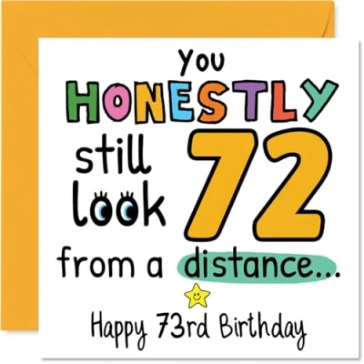 MAKE THEM SMILE WITH THIS UNIQUE BIRTHDAY CARD: This exceptional quality birthday card for him or her shows the design 'You Honestly still look 72 from a distance Happy 73rd Birthday'. If you are looking for special birthday greetings cards for Men birthday card then then this happy birthday card is bound to make them smile. Not just for birthday gifts for Men this could also be for Grandad, Uncle, Wife, Grandma, Nanny, Cousin, Dad or Nan. WHAT DO YOU GET: The card is printed on one side and BLANK ON THE INSIDE to allow you to write your very own message. The unique fun design is printed on a specially sourced and environmentally responsible board. At 360 microns thick the natural white one-sided gloss board has a quality look and feel. Supplied with a coloured gummed envelope to complement the design and ready to be sealed and sent in the post. Great Grandad birthday cards, Uncle birthday card. NO INK SMUDGES: There is nothing worse than writing inside a card to find that the shiny surface makes the ink smudge. This is why we use a high quality one sided coated board. The uncoated side will absorb more of the ink from your pen to make smudging a thing of the past. 73rd Birthday card for Wife, 73rd Birthday card for Grandma, 73rd Birthday card for Nanny. SIZES: Greeting Card = 145mm x 145mm, Envelope = 155mm x 155mm, Card Thickness = 360 micron. Cousin 73rd birthday card, birthday cards for Dad, special birthday cards for Nan, 73rd birthday card Grandad, Uncle 73rd birthday card. MADE AND QUALITY CHECKED IN THE UK: We print and manufacture all our products right here in the UK so you can be sure of a fast turnaround and a product that is expertly made. Using environmentally responsible premium board our card is conscious of the responsible management of the world's forests - perfect birthday cards for Men, fun birthday cards for him, Uncle 73rd birthday cards, female birthday cards.