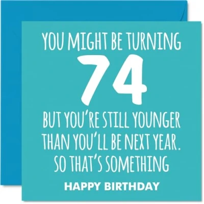 MAKE THEM SMILE WITH THIS UNIQUE BIRTHDAY CARD: This exceptional quality birthday card for him or her shows the design 'You might be turning 74 but youre still younger than youll be next year. So thats something HAPPY BIRTHDAY'. If you are looking for special birthday greetings cards for Men birthday card then this happy birthday card is bound to make them smile. Not just for birthday gifts for Men this could also be for Dad, Nanny, Nan, Sister, Grandad, Uncle, Brother or Auntie. WHAT DO YOU GET: The card is printed on one side and BLANK ON THE INSIDE to allow you to write your very own message. The unique fun design is printed on a specially sourced and environmentally responsible board. At 360 microns thick the natural white one-sided gloss board has a quality look and feel. Supplied with a coloured gummed envelope to complement the design and ready to be sealed and sent in the post. Great Dad birthday cards, Nanny birthday card. NO INK SMUDGES: There is nothing worse than writing inside a card to find that the shiny surface makes the ink smudge. This is why we use a high quality one sided coated board. The uncoated side will absorb more of the ink from your pen to make smudging a thing of the past. 74th Birthday card for Nan, 74th Birthday card for Sister, 74th Birthday card for Grandad. SIZES: Greeting Card = 145mm x 145mm, Envelope = 155mm x 155mm, Card Thickness = 360 micron. Uncle 74th birthday card, birthday cards for Brother, special birthday cards for Auntie, 74th birthday card Dad, Nanny 74th birthday card. MADE AND QUALITY CHECKED IN THE UK: We print and manufacture all our products right here in the UK so you can be sure of a fast turnaround and a product that is expertly made. Using environmentally responsible premium board our card is conscious of the responsible management of the world's forests - perfect birthday cards for Men, fun birthday cards for him, Nanny 74th birthday cards, female birthday cards.