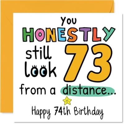 MAKE THEM SMILE WITH THIS UNIQUE BIRTHDAY CARD: This exceptional quality birthday card for him or her shows the design 'You Honestly still look 73 from a distance Happy 74th Birthday'. If you are looking for special birthday greetings cards for Men birthday card then then this happy birthday card is bound to make them smile. Not just for birthday gifts for Men this could also be for Uncle, Wife, Grandma, Nanny, Cousin, Dad, Nan or Sister. WHAT DO YOU GET: The card is printed on one side and BLANK ON THE INSIDE to allow you to write your very own message. The unique fun design is printed on a specially sourced and environmentally responsible board. At 360 microns thick the natural white one-sided gloss board has a quality look and feel. Supplied with a coloured gummed envelope to complement the design and ready to be sealed and sent in the post. Great Uncle birthday cards, Wife birthday card. NO INK SMUDGES: There is nothing worse than writing inside a card to find that the shiny surface makes the ink smudge. This is why we use a high quality one sided coated board. The uncoated side will absorb more of the ink from your pen to make smudging a thing of the past. 74th Birthday card for Grandma, 74th Birthday card for Nanny, 74th Birthday card for Cousin. SIZES: Greeting Card = 145mm x 145mm, Envelope = 155mm x 155mm, Card Thickness = 360 micron. Dad 74th birthday card, birthday cards for Nan, special birthday cards for Sister, 74th birthday card Uncle, Wife 74th birthday card. MADE AND QUALITY CHECKED IN THE UK: We print and manufacture all our products right here in the UK so you can be sure of a fast turnaround and a product that is expertly made. Using environmentally responsible premium board our card is conscious of the responsible management of the world's forests - perfect birthday cards for Men, fun birthday cards for him, Wife 74th birthday cards, female birthday cards.