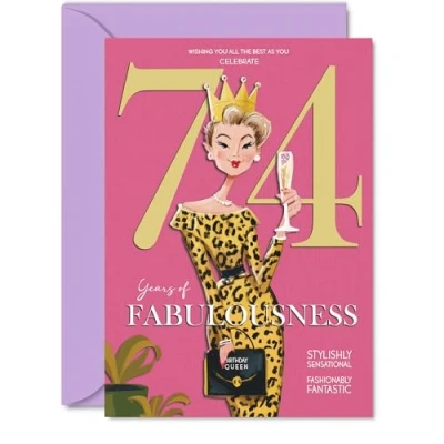 MAKE HER SMILE WITH THIS UNIQUE BIRTHDAY CARD: This exceptional quality birthday card for her shows the design 'Wishing you all the best as you celebrate 74 years of fabulousness'. If you are looking for special birthday greetings cards for Women birthday card then then this happy birthday card is bound to make her smile. Not just for birthday gifts for Women this could also be for Cousin, Granny, Nanny, Sister, Wife, Grandma, Auntie or Nan. WHAT DO YOU GET: The cards are printed on both sides with the inside print saying 'Have a Luminously Lovely Day' and ample space for your own personal message. The unique design is printed on a specially sourced and environmentally responsible board. At 360 microns thick the natural white one-sided gloss board has a quality look and feel. Supplied with a coloured gummed envelope to complement the design and ready to be sealed and sent in the post. NO INK SMUDGES: There is nothing worse than writing inside a card to find that the shiny surface makes the ink smudge. This is why we use a high quality one sided coated board. The uncoated side will absorb more of the ink from your pen to make smudging a thing of the past. 74th Birthday card for Nanny, 74th Birthday card for Sister, 74th Birthday card for Wife. SIZES: Greeting Card = 127mm x 178mm, Envelope = 130mm x 180mm, Card Thickness = 360 micron. Grandma 74th birthday card, birthday cards for Auntie, cute birthday cards for Nan, 74th birthday card Cousin, Granny 74th birthday card. MADE AND QUALITY CHECKED IN THE UK: We print and manufacture all our products right here in the UK so you can be sure of a fast turnaround and a product that is expertly made. Using environmentally responsible premium board our card is conscious of the responsible management of the world's forests - perfect birthday cards for Women, fun birthday cards for her, Granny 74th birthday cards, female birthday cards.
