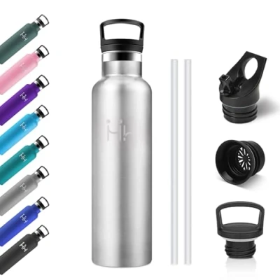 DOUBLE WALLED INSULATION - This 750ml insulated water bottle is made of high quality stainless steel and features double walled vacuum insulation. Keeps drinks hot for 12 hours and cold for up to 24 hours. With optimal capacity and easy to carry, it is perfect for the office, daily commutes or outings around the city. Enjoy your drink at the ideal temperature wherever you are. 2 REPLACEMENT LIDS: (1)Lid with straw: allows you to drink easily without removing the cap and adding ice cubes thanks to the 50mm mouth, ideal for sports and outdoor activities. (2) Lid with Handle: Equipped with carrying ring and filter, stops tea, fruit and ice while drinking. Note: The filter must be used with the lid, otherwise it will not fit the bottle properly. 100% LEAK PROOF - Gym water bottle equipped with a durable silicone ring, offers total protection against leaks and splashes. Ideal for backpacks, gym bags or school bags. The anti-condensation outer surface ensures a firm grip. BPA FREE MATERIAL: Unlike cheap plastic bottles that release chemicals and affect taste, this 750ml insulated bottle is made of high quality 18/8 stainless steel. Durable, anti-rust and anti-corruption, it is free from BPA and other harmful substances. Reusable Water Bottle: Choose a healthy and eco-friendly lifestyle with this modern design water bottle! The gradient matte finish, excellent thermal insulation and practical handle cap make it stylish and functional. A perfect gift for children, friends, lovers or loved ones.
