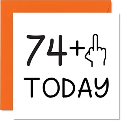 MAKE THEM LAUGH WITH THIS FUNNY BIRTHDAY CARD: This exceptional quality birthday card for her or him shows the design '74 + Middle Finger Today'. If you are looking for funny birthday greetings cards for men, then then this happy birthday card is bound to make them laugh. Not just for friendship gifts for women this could also be for Son, Daughter, Friend, Work Colleague, Brother, Sister, Auntie or Uncle. WHAT DO YOU GET: The card is printed on one side and BLANK ON THE INSIDE to allow you to write your very own message. The unique fun design is printed on a specially sourced and environmentally responsible board. At 360 microns thick the natural white one-sided gloss board has a quality look and feel. Supplied with a coloured gummed envelope to complement the design and ready to be sealed and sent in the post. Funny presents for females, rude birthday cards for women. NO INK SMUDGES: There is nothing worse than writing inside a card to find that the shiny surface makes the ink smudge. This is why we use a high quality one sided coated board. The uncoated side will absorb more of the ink from your pen to make smudging a thing of the past. Son 75th birthday card, 75 birthday card, happy birthday cards. SIZES: Greeting Card = 145mm x 145mm, Envelope = 155mm x 155mm, Card Thickness = 360 micron. Great Son birthday cards from Dad, Mum, Daughter, Brother or Sister birthday card. 75th birthday card funny, happy birthday Son cards, 75th birthday cards for men. MADE AND QUALITY CHECKED IN THE UK: We print and manufacture all our product right her in the UK so you can be sure of a fast turnaround and a product that is expertly made. Using environmentally responsible premium board our card is conscious of the responsible management of the world's forests - Funny Son birthday card, funny cards, Step Son birthday card, rude birthday cards for women, funny birthday cards for her, Daughter 75th birthday cards, funny male birthday cards.