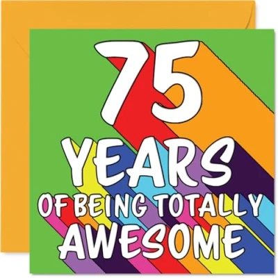 MAKE THEM SMILE WITH THIS UNIQUE BIRTHDAY CARD: This exceptional quality birthday card for him or her shows the design '75 YEARS OF BEING TOTALLY AWESOME'. If you are looking for special birthday greetings cards for Men birthday card then then this happy birthday card is bound to make them smile. Not just for birthday gifts for Men this could also be for Nanny, Nan, Sister, Grandad, Uncle, Brother, Auntie or Husband. WHAT DO YOU GET: The card is printed on one side and BLANK ON THE INSIDE to allow you to write your very own message. The unique fun design is printed on a specially sourced and environmentally responsible board. At 360 microns thick the natural white one-sided gloss board has a quality look and feel. Supplied with a coloured gummed envelope to complement the design and ready to be sealed and sent in the post. Great Nanny birthday cards, Nan birthday card. DESIGNED FOR WRITING: There is nothing worse than writing inside a card to find that the shiny surface makes the ink smudge. This is why we use a high quality one sided coated board. The uncoated side will absorb more of the ink from your pen to make smudging a thing of the past. 75th Birthday card for Sister, 75th Birthday card for Grandad, 75th Birthday card for Uncle. SIZES: Greeting Card = 145mm x 145mm, Envelope = 155mm x 155mm, Card Thickness = 360 micron. Brother 75th birthday card, birthday cards for Auntie, special birthday cards for Husband, 75th birthday card Nanny, Nan 75th birthday card. MADE AND QUALITY CHECKED IN THE UK: We print and manufacture all our products right here in the UK so you can be sure of a fast turnaround and a product that is expertly made. Using environmentally responsible premium board our card is conscious of the responsible management of the world's forests - perfect birthday cards for Men, fun birthday cards for him, Nan 75th birthday cards, female birthday cards.