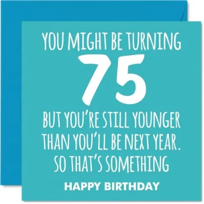 MAKE THEM SMILE WITH THIS UNIQUE BIRTHDAY CARD: This exceptional quality birthday card for him or her shows the design 'You might be turning 75 but youre still younger than youll be next year. So thats something HAPPY BIRTHDAY'. If you are looking for special birthday greetings cards for Men birthday card then this happy birthday card is bound to make them smile. Not just for birthday gifts for Men this could also be for Nanny, Nan, Sister, Grandad, Uncle, Brother, Auntie or Husband. WHAT DO YOU GET: The card is printed on one side and BLANK ON THE INSIDE to allow you to write your very own message. The unique fun design is printed on a specially sourced and environmentally responsible board. At 360 microns thick the natural white one-sided gloss board has a quality look and feel. Supplied with a coloured gummed envelope to complement the design and ready to be sealed and sent in the post. Great Nanny birthday cards, Nan birthday card. NO INK SMUDGES: There is nothing worse than writing inside a card to find that the shiny surface makes the ink smudge. This is why we use a high quality one sided coated board. The uncoated side will absorb more of the ink from your pen to make smudging a thing of the past. 75th Birthday card for Sister, 75th Birthday card for Grandad, 75th Birthday card for Uncle. SIZES: Greeting Card = 145mm x 145mm, Envelope = 155mm x 155mm, Card Thickness = 360 micron. Brother 75th birthday card, birthday cards for Auntie, special birthday cards for Husband, 75th birthday card Nanny, Nan 75th birthday card. MADE AND QUALITY CHECKED IN THE UK: We print and manufacture all our products right here in the UK so you can be sure of a fast turnaround and a product that is expertly made. Using environmentally responsible premium board our card is conscious of the responsible management of the world's forests - perfect birthday cards for Men, fun birthday cards for him, Nan 75th birthday cards, female birthday cards.