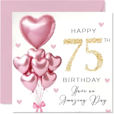 75th Birthday Cards for Women Pink Glitter Balloons Happy Card 75 Year Old Woman Sister Cousin Auntie Grandma, 145mm Bday Greeting