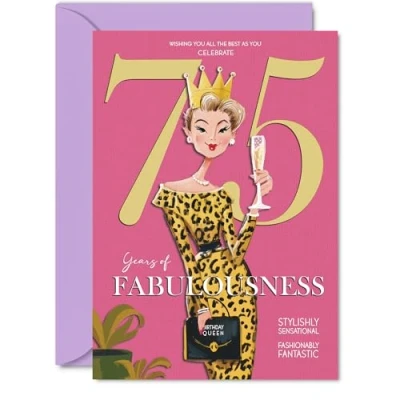 MAKE HER SMILE WITH THIS UNIQUE BIRTHDAY CARD: This exceptional quality birthday card for her shows the design 'Wishing you all the best as you celebrate 75 years of fabulousness'. If you are looking for special birthday greetings cards for Women birthday card then then this happy birthday card is bound to make her smile. Not just for birthday gifts for Women this could also be for Auntie, Cousin, Nanny, Sister, Grandma, Granny, Nan or Wife. WHAT DO YOU GET: The cards are printed on both sides with the inside print saying 'Have a Luminously Lovely Day' and ample space for your own personal message. The unique design is printed on a specially sourced and environmentally responsible board. At 360 microns thick the natural white one-sided gloss board has a quality look and feel. Supplied with a coloured gummed envelope to complement the design and ready to be sealed and sent in the post. NO INK SMUDGES: There is nothing worse than writing inside a card to find that the shiny surface makes the ink smudge. This is why we use a high quality one sided coated board. The uncoated side will absorb more of the ink from your pen to make smudging a thing of the past. 75th Birthday card for Nanny, 75th Birthday card for Sister, 75th Birthday card for Grandma. SIZES: Greeting Card = 148mm x 210mm, Envelope = 150mm x 212mm, Card Thickness = 360 micron. Granny 75th birthday card, birthday cards for Nan, cute birthday cards for Wife, 75th birthday card Auntie, Cousin 75th birthday card. MADE AND QUALITY CHECKED IN THE UK: We print and manufacture all our products right here in the UK so you can be sure of a fast turnaround and a product that is expertly made. Using environmentally responsible premium board our card is conscious of the responsible management of the world's forests - perfect birthday cards for Women, fun birthday cards for her, Cousin 75th birthday cards, female birthday cards.