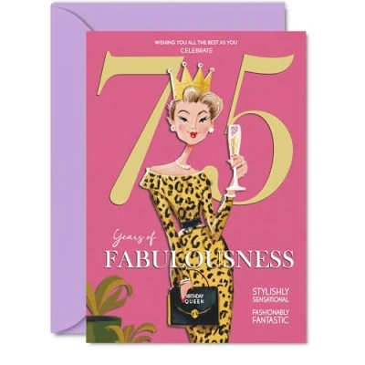 MAKE HER SMILE WITH THIS UNIQUE BIRTHDAY CARD: This exceptional quality birthday card for her shows the design 'Wishing you all the best as you celebrate 75 years of fabulousness'. If you are looking for special birthday greetings cards for Women birthday card then then this happy birthday card is bound to make her smile. Not just for birthday gifts for Women this could also be for Granny, Nanny, Sister, Wife, Grandma, Auntie, Nan or Cousin. WHAT DO YOU GET: The cards are printed on both sides with the inside print saying 'Have a Luminously Lovely Day' and ample space for your own personal message. The unique design is printed on a specially sourced and environmentally responsible board. At 360 microns thick the natural white one-sided gloss board has a quality look and feel. Supplied with a coloured gummed envelope to complement the design and ready to be sealed and sent in the post. NO INK SMUDGES: There is nothing worse than writing inside a card to find that the shiny surface makes the ink smudge. This is why we use a high quality one sided coated board. The uncoated side will absorb more of the ink from your pen to make smudging a thing of the past. 75th Birthday card for Sister, 75th Birthday card for Wife, 75th Birthday card for Grandma. SIZES: Greeting Card = 127mm x 178mm, Envelope = 130mm x 180mm, Card Thickness = 360 micron. Auntie 75th birthday card, birthday cards for Nan, cute birthday cards for Cousin, 75th birthday card Granny, Nanny 75th birthday card. MADE AND QUALITY CHECKED IN THE UK: We print and manufacture all our products right here in the UK so you can be sure of a fast turnaround and a product that is expertly made. Using environmentally responsible premium board our card is conscious of the responsible management of the world's forests - perfect birthday cards for Women, fun birthday cards for her, Nanny 75th birthday cards, female birthday cards.