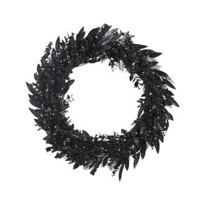 76 cm wreath with mixed pine and black glitter finish 50 dual LEDs with warm and cold white light settings 12 lighting modes including steady, twinkle and fade 6-hour timer with automatic 18-hour switch-off Requires 3 x AAbatteries (not included) with 30 cm lead wire