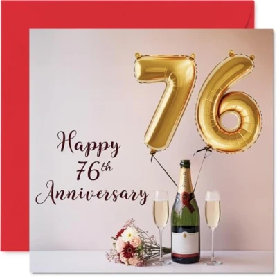 MAKE THEM SMILE WITH THIS ROMANTIC ANNIVERSARY CARD: This exceptional quality anniversary card for her or him shows the design 'Happy 76th Anniversary'. If you are looking for special anniversary greetings cards for Women anniversary card then then this happy anniversary card is bound to make them smile. Not just for anniversary gifts for Men this could also be for Companion, Wife, Partner, Husband, 0 or 0. WHAT DO YOU GET: The card is printed on one side and BLANK ON THE INSIDE to allow you to write your very own message. The unique fun design is printed on a specially sourced and environmentally responsible board. At 360 microns thick the natural white one-sided gloss board has a quality look and feel. Supplied with a coloured gummed envelope to complement the design and ready to be sealed and sent in the post. Great Companion anniversary cards, 76th anniversary card, Wife anniversary card. NO INK SMUDGES: There is nothing worse than writing inside a card to find that the shiny surface makes the ink smudge. This is why we use a high quality one sided coated board. The uncoated side will absorb more of the ink from your pen to make smudging a thing of the past. 76th anniversary card for Partner, 76th anniversary card for Husband, 76th anniversary card for 0. SIZES: Greeting Card = 145mm x 145mm, Envelope = 155mm x 155mm, Card Thickness = 360 micron. 0 76th anniversary card, anniversary cards for Partner, cute anniversary cards for Husband, 76th anniversary card Companion, Wife 76th anniversary card. MADE AND QUALITY CHECKED IN THE UK: We print and manufacture all our products right here in the UK so you can be sure of a fast turnaround and a product that is expertly made. Using environmentally responsible premium board our card is conscious of the responsible management of the world's forests - perfect anniversary cards for Men, cute anniversary cards for her, Wife 76th anniversary cards, female anniversary cards.