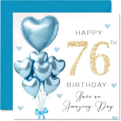 76th Birthday Cards for Men Blue Glitter Balloons Happy Card 76 Year Old Man Dad Grandpa Uncle Brother, 145mm Bday Greeting