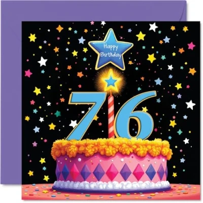 MAKE THEM SMILE WITH THIS UNIQUE BIRTHDAY CARD: This exceptional quality birthday card for him or her shows the design 'Happy Birthday 76'. If you are looking for special birthday greetings cards for Men birthday card then then this happy birthday card is bound to make them smile. Not just for birthday gifts for Men this could also be for Cousin, Nan, Grandma, Nanny, Husband, Auntie, Dad or Uncle. WHAT DO YOU GET: The card is printed on one side and BLANK ON THE INSIDE to allow you to write your very own message. The unique fun design is printed on a specially sourced and environmentally responsible board. At 360 microns thick the natural white one-sided gloss board has a quality look and feel. Supplied with a coloured gummed envelope to complement the design and ready to be sealed and sent in the post. Great Cousin birthday cards, Nan birthday card. NO INK SMUDGES: There is nothing worse than writing inside a card to find that the shiny surface makes the ink smudge. This is why we use a high quality one sided coated board. The uncoated side will absorb more of the ink from your pen to make smudging a thing of the past. 76th Birthday card for Grandma, 76th Birthday card for Nanny, 76th Birthday card for Husband. SIZES: Greeting Card = 145mm x 145mm, Envelope = 155mm x 155mm, Card Thickness = 360 micron. Auntie 76th birthday card, birthday cards for Dad, special birthday cards for Uncle, 76th birthday card Cousin, Nan 76th birthday card. MADE AND QUALITY CHECKED IN THE UK: We print and manufacture all our products right here in the UK so you can be sure of a fast turnaround and a product that is expertly made. Using environmentally responsible premium board our card is conscious of the responsible management of the world's forests - perfect birthday cards for Men, fun birthday cards for him, Nan 76th birthday cards, female birthday cards.