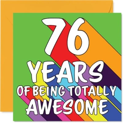 MAKE THEM SMILE WITH THIS UNIQUE BIRTHDAY CARD: This exceptional quality birthday card for him or her shows the design '76 YEARS OF BEING TOTALLY AWESOME'. If you are looking for special birthday greetings cards for Men birthday card then then this happy birthday card is bound to make them smile. Not just for birthday gifts for Men this could also be for Nan, Sister, Grandad, Uncle, Brother, Auntie, Husband or Grandma. WHAT DO YOU GET: The card is printed on one side and BLANK ON THE INSIDE to allow you to write your very own message. The unique fun design is printed on a specially sourced and environmentally responsible board. At 360 microns thick the natural white one-sided gloss board has a quality look and feel. Supplied with a coloured gummed envelope to complement the design and ready to be sealed and sent in the post. Great Nan birthday cards, Sister birthday card. DESIGNED FOR WRITING: There is nothing worse than writing inside a card to find that the shiny surface makes the ink smudge. This is why we use a high quality one sided coated board. The uncoated side will absorb more of the ink from your pen to make smudging a thing of the past. 76th Birthday card for Grandad, 76th Birthday card for Uncle, 76th Birthday card for Brother. SIZES: Greeting Card = 145mm x 145mm, Envelope = 155mm x 155mm, Card Thickness = 360 micron. Auntie 76th birthday card, birthday cards for Husband, special birthday cards for Grandma, 76th birthday card Nan, Sister 76th birthday card. MADE AND QUALITY CHECKED IN THE UK: We print and manufacture all our products right here in the UK so you can be sure of a fast turnaround and a product that is expertly made. Using environmentally responsible premium board our card is conscious of the responsible management of the world's forests - perfect birthday cards for Men, fun birthday cards for him, Sister 76th birthday cards, female birthday cards.