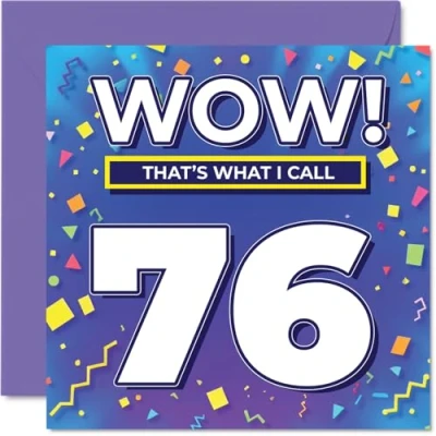 MAKE THEM SMILE WITH THIS UNIQUE BIRTHDAY CARD: This exceptional quality birthday card for him or her shows the design 'Wow! That?s What I Call 76'. If you are looking for special birthday greetings cards for Men birthday card then then this happy birthday card is bound to make them smile. Not just for birthday gifts for Men this could also be for Nan, Sister, Grandad, Uncle, Brother, Auntie, Husband or Grandma. WHAT DO YOU GET: The card is printed on one side and BLANK ON THE INSIDE to allow you to write your very own message. The unique fun design is printed on a specially sourced and environmentally responsible board. At 360 microns thick the natural white one-sided gloss board has a quality look and feel. Supplied with a coloured gummed envelope to complement the design and ready to be sealed and sent in the post. Great Nan birthday cards, Sister birthday card. DESIGNED FOR WRITING: There is nothing worse than writing inside a card to find that the shiny surface makes the ink smudge. This is why we use a high quality one sided coated board. The uncoated side will absorb more of the ink from your pen to make smudging a thing of the past. 76th Birthday card for Grandad, 76th Birthday card for Uncle, 76th Birthday card for Brother. SIZES: Greeting Card = 145mm x 145mm, Envelope = 155mm x 155mm, Card Thickness = 360 micron. Auntie 76th birthday card, birthday cards for Husband, special birthday cards for Grandma, 76th birthday card Nan, Sister 76th birthday card. MADE AND QUALITY CHECKED IN THE UK: We print and manufacture all our products right here in the UK so you can be sure of a fast turnaround and a product that is expertly made. Using environmentally responsible premium board our card is conscious of the responsible management of the world's forests - perfect birthday cards for Men, fun birthday cards for him, Sister 76th birthday cards, female birthday cards.