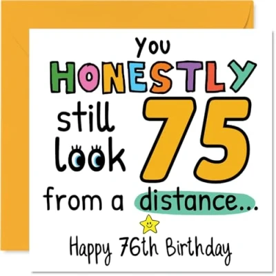 MAKE THEM SMILE WITH THIS UNIQUE BIRTHDAY CARD: This exceptional quality birthday card for him or her shows the design 'You Honestly still look 75 from a distance Happy 76th Birthday'. If you are looking for special birthday greetings cards for Men birthday card then then this happy birthday card is bound to make them smile. Not just for birthday gifts for Men this could also be for Grandma, Nanny, Cousin, Dad, Nan, Sister, Husband or Auntie. WHAT DO YOU GET: The card is printed on one side and BLANK ON THE INSIDE to allow you to write your very own message. The unique fun design is printed on a specially sourced and environmentally responsible board. At 360 microns thick the natural white one-sided gloss board has a quality look and feel. Supplied with a coloured gummed envelope to complement the design and ready to be sealed and sent in the post. Great Grandma birthday cards, Nanny birthday card. NO INK SMUDGES: There is nothing worse than writing inside a card to find that the shiny surface makes the ink smudge. This is why we use a high quality one sided coated board. The uncoated side will absorb more of the ink from your pen to make smudging a thing of the past. 76th Birthday card for Cousin, 76th Birthday card for Dad, 76th Birthday card for Nan. SIZES: Greeting Card = 145mm x 145mm, Envelope = 155mm x 155mm, Card Thickness = 360 micron. Sister 76th birthday card, birthday cards for Husband, special birthday cards for Auntie, 76th birthday card Grandma, Nanny 76th birthday card. MADE AND QUALITY CHECKED IN THE UK: We print and manufacture all our products right here in the UK so you can be sure of a fast turnaround and a product that is expertly made. Using environmentally responsible premium board our card is conscious of the responsible management of the world's forests - perfect birthday cards for Men, fun birthday cards for him, Nanny 76th birthday cards, female birthday cards.