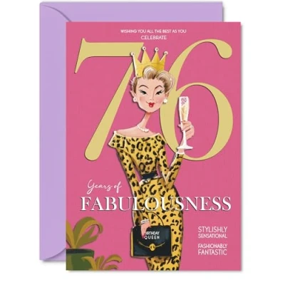 MAKE HER SMILE WITH THIS UNIQUE BIRTHDAY CARD: This exceptional quality birthday card for her shows the design 'Wishing you all the best as you celebrate 76 years of fabulousness'. If you are looking for special birthday greetings cards for Women birthday card then then this happy birthday card is bound to make her smile. Not just for birthday gifts for Women this could also be for Cousin, Nanny, Sister, Grandma, Granny, Nan, Wife or Auntie. WHAT DO YOU GET: The cards are printed on both sides with the inside print saying 'Have a Luminously Lovely Day' and ample space for your own personal message. The unique design is printed on a specially sourced and environmentally responsible board. At 360 microns thick the natural white one-sided gloss board has a quality look and feel. Supplied with a coloured gummed envelope to complement the design and ready to be sealed and sent in the post. NO INK SMUDGES: There is nothing worse than writing inside a card to find that the shiny surface makes the ink smudge. This is why we use a high quality one sided coated board. The uncoated side will absorb more of the ink from your pen to make smudging a thing of the past. 76th Birthday card for Sister, 76th Birthday card for Grandma, 76th Birthday card for Granny. SIZES: Greeting Card = 148mm x 210mm, Envelope = 150mm x 212mm, Card Thickness = 360 micron. Nan 76th birthday card, birthday cards for Wife, cute birthday cards for Auntie, 76th birthday card Cousin, Nanny 76th birthday card. MADE AND QUALITY CHECKED IN THE UK: We print and manufacture all our products right here in the UK so you can be sure of a fast turnaround and a product that is expertly made. Using environmentally responsible premium board our card is conscious of the responsible management of the world's forests - perfect birthday cards for Women, fun birthday cards for her, Nanny 76th birthday cards, female birthday cards.