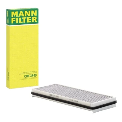 MANN-FILTER Cabin Air Filter CUK 3840 / Dimensions (mm): A = 382; B = 152; H = 39 / Premium Filter in Original Equipment Quality High-quality MANN-FILTER cabin filters with active carbon - nearly 100% protection from particles like pollen, diesel soot & tyre abrasion / Additional protection from harmful gases & unpleasant odour The trated highly-effective activated carbon gives protection against harmful gases such as ozone, nitrogen oxide or sulphur dioxide and eliminates unpleasant odours during the entire service interval Looking to find the correct filter? Select: brand, model, vehicle type, and engine type above to see which one fits your vehicle MANN+HUMMEL complies with REACH-regulation + supports the goal of Improved health and safety through the design, manufacturing, usage, disposal and recycling of our products