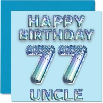 77th Birthday Card for Uncle Blue Glitter Party Balloons Happy Cards 77 Year Old from Nephew Niece, 145mm x Bday Greeting Gift