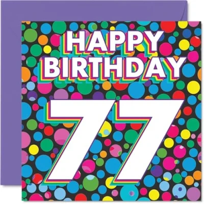 77th Birthday Cards for Women Men Funky Rainbow Dots Happy Card 77 Year Old Woman Man Wife Nan Nanny Sister, 145mm Bday Greeting