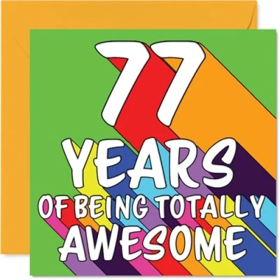 MAKE THEM SMILE WITH THIS UNIQUE BIRTHDAY CARD: This exceptional quality birthday card for him or her shows the design '77 YEARS OF BEING TOTALLY AWESOME'. If you are looking for special birthday greetings cards for Men birthday card then then this happy birthday card is bound to make them smile. Not just for birthday gifts for Men this could also be for Sister, Grandad, Uncle, Brother, Auntie, Husband, Grandma or Cousin. WHAT DO YOU GET: The card is printed on one side and BLANK ON THE INSIDE to allow you to write your very own message. The unique fun design is printed on a specially sourced and environmentally responsible board. At 360 microns thick the natural white one-sided gloss board has a quality look and feel. Supplied with a coloured gummed envelope to complement the design and ready to be sealed and sent in the post. Great Sister birthday cards, Grandad birthday card. DESIGNED FOR WRITING: There is nothing worse than writing inside a card to find that the shiny surface makes the ink smudge. This is why we use a high quality one sided coated board. The uncoated side will absorb more of the ink from your pen to make smudging a thing of the past. 77th Birthday card for Uncle, 77th Birthday card for Brother, 77th Birthday card for Auntie. SIZES: Greeting Card = 145mm x 145mm, Envelope = 155mm x 155mm, Card Thickness = 360 micron. Husband 77th birthday card, birthday cards for Grandma, special birthday cards for Cousin, 77th birthday card Sister, Grandad 77th birthday card. MADE AND QUALITY CHECKED IN THE UK: We print and manufacture all our products right here in the UK so you can be sure of a fast turnaround and a product that is expertly made. Using environmentally responsible premium board our card is conscious of the responsible management of the world's forests - perfect birthday cards for Men, fun birthday cards for him, Grandad 77th birthday cards, female birthday cards.
