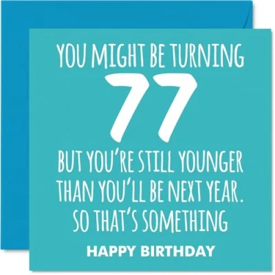 MAKE THEM SMILE WITH THIS UNIQUE BIRTHDAY CARD: This exceptional quality birthday card for him or her shows the design 'You might be turning 77 but youre still younger than youll be next year. So thats something HAPPY BIRTHDAY'. If you are looking for special birthday greetings cards for Men birthday card then this happy birthday card is bound to make them smile. Not just for birthday gifts for Men this could also be for Sister, Grandad, Uncle, Brother, Auntie, Husband, Grandma or Cousin. WHAT DO YOU GET: The card is printed on one side and BLANK ON THE INSIDE to allow you to write your very own message. The unique fun design is printed on a specially sourced and environmentally responsible board. At 360 microns thick the natural white one-sided gloss board has a quality look and feel. Supplied with a coloured gummed envelope to complement the design and ready to be sealed and sent in the post. Great Sister birthday cards, Grandad birthday card. NO INK SMUDGES: There is nothing worse than writing inside a card to find that the shiny surface makes the ink smudge. This is why we use a high quality one sided coated board. The uncoated side will absorb more of the ink from your pen to make smudging a thing of the past. 77th Birthday card for Uncle, 77th Birthday card for Brother, 77th Birthday card for Auntie. SIZES: Greeting Card = 145mm x 145mm, Envelope = 155mm x 155mm, Card Thickness = 360 micron. Husband 77th birthday card, birthday cards for Grandma, special birthday cards for Cousin, 77th birthday card Sister, Grandad 77th birthday card. MADE AND QUALITY CHECKED IN THE UK: We print and manufacture all our products right here in the UK so you can be sure of a fast turnaround and a product that is expertly made. Using environmentally responsible premium board our card is conscious of the responsible management of the world's forests - perfect birthday cards for Men, fun birthday cards for him, Grandad 77th birthday cards, female birthday cards.