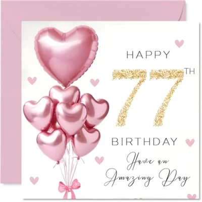 77th Birthday Cards for Women Pink Glitter Balloons Happy Card 77 Year Old Woman Granny Nan Cousin Sister, 145mm Bday Greeting