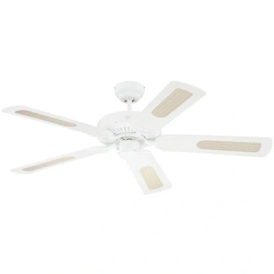 AmazonTraditional 122 cm indoor ceiling fan with white finish is ideal for large rooms up to 20 square meters Five reversible blades with the option of a white or white cane finish Remote control adaptable High-quality motor delivers powerful air movement and quiet performance, reverse function for summer/winter operation Install with or without included extension rod, illustrated instruction manual, 10-Year Limited Warranty on the motor