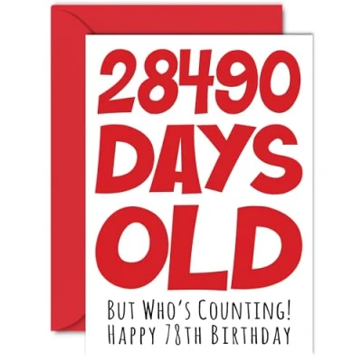 MAKE THEM LAUGH WITH THIS FUNNY BIRTHDAY CARD: This exceptional quality birthday card for her or him shows the design 28490 Days Old But Who's Counting! Happy 78th Birthday. If you are looking for funny birthday cards for women, then then this happy birthday card is bound to make them laugh. Not just for friendship gifts for women this could also be for Mum, Dad, Nan, Grandad, Best Friend, Brother, Sister, Cousin, Auntie or Uncle. WHAT DO YOU GET: The card is printed on one side and BLANK ON THE INSIDE to allow you to write your very own message. The unique fun design is printed on a specially sourced and environmentally responsible board. At 360 microns thick the natural white one-sided gloss board has a quality look and feel. Supplied with a coloured gummed envelope to complement the design and ready to be sealed and sent in the post. Great Nanny birthday cards, 78th birthday card, adult birthday card. NO INK SMUDGES: There is nothing worse than writing inside a card to find that the shiny surface makes the ink smudge. This is why we use a high quality one sided coated board. The uncoated side will absorb more of the ink from your pen to make smudging a thing of the past. 78th birthday card funny, happy birthday Grandad cards, 78th birthday cards for men. SIZES: Greeting Card = 148mm x 210mm, Envelope = 150mm x 212mm, Card Thickness = 360 micron. Great Dad or Mum birthday cards from Son or Daughter. Mum 78th birthday card, birthday cards for brother, rude birthday cards for men, 78th birthday card sister, Grandma 78th birthday card. MADE AND QUALITY CHECKED IN THE UK: We print and manufacture all our product right her in the UK so you can be sure of a fast turnaround and a product that is expertly made. Using environmentally responsible premium board our card is conscious of the responsible management of the world's forests - rude birthday cards for women, funny birthday cards for her, Great Grandad 78th birthday cards, funny male birthday cards.
