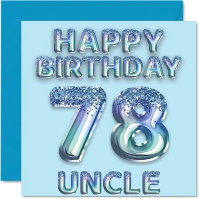 MAKE YOUR UNCLE SMILE WITH THIS AWESOME BIRTHDAY CARD: This exceptional quality birthday card for him shows the design of blue glitter balloons stating 'Happy Birthday 78' Uncle'. If you are looking for funny birthday cards for men, then then this happy birthday card is bound to make them laugh. Not just for friendship gifts for men this could also be for Uncle or Step Uncle. WHAT DO YOU GET: The card is printed on one side and BLANK ON THE INSIDE to allow you to write your very own message. The unique fun design is printed on a specially sourced and environmentally responsible board. At 360 microns thick the natural white one-sided gloss board has a quality look and feel. Supplied with a coloured gummed envelope to complement the design and ready to be sealed and sent in the post. Birthday card for Uncle, 78th birthday card for him. NO INK SMUDGES: There is nothing worse than writing inside a card to find that the shiny surface makes the ink smudge. This is why we use a high quality one sided coated board. The uncoated side will absorb more of the ink from your pen to make smudging a thing of the past. Uncle birthday cards, birthday card cute, 78th birthday gifts for Uncle, Uncle birthday cards. SIZES: Greeting Card = 145mm x 145mm, Envelope = 155mm x 155mm, Card Thickness = 360 micron. Great Uncle birthday cards from Niece and Nephew, male birthday card, 78th birthday card, happy birthday Uncle cards, family birthday card. MADE AND QUALITY CHECKED IN THE UK: We print and manufacture all our product right her in the UK so you can be sure of a fast turnaround and a product that is expertly made. Using environmentally responsible premium board our card is conscious of the responsible management of the world's forests.