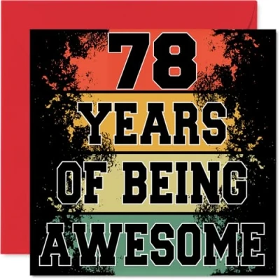 MAKE THEM SMILE WITH THIS UNIQUE BIRTHDAY CARD: This exceptional quality birthday card for him or her shows the design '78 Years Of Being Awesome'. If you are looking for special birthday greetings cards for Men birthday card then then this happy birthday card is bound to make them smile. Not just for birthday gifts for Men this could also be for Grandad, Uncle, Brother, Auntie, Husband, Grandma, Cousin or Wife. WHAT DO YOU GET: The card is printed on one side and BLANK ON THE INSIDE to allow you to write your very own message. The unique fun design is printed on a specially sourced and environmentally responsible board. At 360 microns thick the natural white one-sided gloss board has a quality look and feel. Supplied with a coloured gummed envelope to complement the design and ready to be sealed and sent in the post. Great Grandad birthday cards, Uncle birthday card. NO INK SMUDGES: There is nothing worse than writing inside a card to find that the shiny surface makes the ink smudge. This is why we use a high quality one sided coated board. The uncoated side will absorb more of the ink from your pen to make smudging a thing of the past. 78th Birthday card for Brother, 78th Birthday card for Auntie, 78th Birthday card for Husband. SIZES: Greeting Card = 145mm x 145mm, Envelope = 155mm x 155mm, Card Thickness = 360 micron. Grandma 78th birthday card, birthday cards for Cousin, special birthday cards for Wife, 78th birthday card Grandad, Uncle 78th birthday card. MADE AND QUALITY CHECKED IN THE UK: We print and manufacture all our products right here in the UK so you can be sure of a fast turnaround and a product that is expertly made. Using environmentally responsible premium board our card is conscious of the responsible management of the world's forests - perfect birthday cards for Men, fun birthday cards for him, Uncle 78th birthday cards, female birthday cards.
