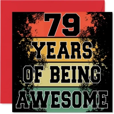 MAKE THEM SMILE WITH THIS UNIQUE BIRTHDAY CARD: This exceptional quality birthday card for him or her shows the design '79 Years Of Being Awesome'. If you are looking for special birthday greetings cards for Men birthday card then then this happy birthday card is bound to make them smile. Not just for birthday gifts for Men this could also be for Uncle, Brother, Auntie, Husband, Grandma, Cousin, Wife or Dad. WHAT DO YOU GET: The card is printed on one side and BLANK ON THE INSIDE to allow you to write your very own message. The unique fun design is printed on a specially sourced and environmentally responsible board. At 360 microns thick the natural white one-sided gloss board has a quality look and feel. Supplied with a coloured gummed envelope to complement the design and ready to be sealed and sent in the post. Great Uncle birthday cards, Brother birthday card. NO INK SMUDGES: There is nothing worse than writing inside a card to find that the shiny surface makes the ink smudge. This is why we use a high quality one sided coated board. The uncoated side will absorb more of the ink from your pen to make smudging a thing of the past. 79th Birthday card for Auntie, 79th Birthday card for Husband, 79th Birthday card for Grandma. SIZES: Greeting Card = 145mm x 145mm, Envelope = 155mm x 155mm, Card Thickness = 360 micron. Cousin 79th birthday card, birthday cards for Wife, special birthday cards for Dad, 79th birthday card Uncle, Brother 79th birthday card. MADE AND QUALITY CHECKED IN THE UK: We print and manufacture all our products right here in the UK so you can be sure of a fast turnaround and a product that is expertly made. Using environmentally responsible premium board our card is conscious of the responsible management of the world's forests - perfect birthday cards for Men, fun birthday cards for him, Brother 79th birthday cards, female birthday cards.