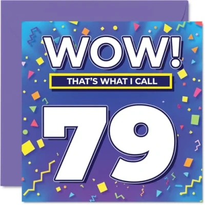MAKE THEM SMILE WITH THIS UNIQUE BIRTHDAY CARD: This exceptional quality birthday card for him or her shows the design 'Wow! That?s What I Call 79'. If you are looking for special birthday greetings cards for Men birthday card then then this happy birthday card is bound to make them smile. Not just for birthday gifts for Men this could also be for Uncle, Brother, Auntie, Husband, Grandma, Cousin, Wife or Dad. WHAT DO YOU GET: The card is printed on one side and BLANK ON THE INSIDE to allow you to write your very own message. The unique fun design is printed on a specially sourced and environmentally responsible board. At 360 microns thick the natural white one-sided gloss board has a quality look and feel. Supplied with a coloured gummed envelope to complement the design and ready to be sealed and sent in the post. Great Uncle birthday cards, Brother birthday card. DESIGNED FOR WRITING: There is nothing worse than writing inside a card to find that the shiny surface makes the ink smudge. This is why we use a high quality one sided coated board. The uncoated side will absorb more of the ink from your pen to make smudging a thing of the past. 79th Birthday card for Auntie, 79th Birthday card for Husband, 79th Birthday card for Grandma. SIZES: Greeting Card = 145mm x 145mm, Envelope = 155mm x 155mm, Card Thickness = 360 micron. Cousin 79th birthday card, birthday cards for Wife, special birthday cards for Dad, 79th birthday card Uncle, Brother 79th birthday card. MADE AND QUALITY CHECKED IN THE UK: We print and manufacture all our products right here in the UK so you can be sure of a fast turnaround and a product that is expertly made. Using environmentally responsible premium board our card is conscious of the responsible management of the world's forests - perfect birthday cards for Men, fun birthday cards for him, Brother 79th birthday cards, female birthday cards.