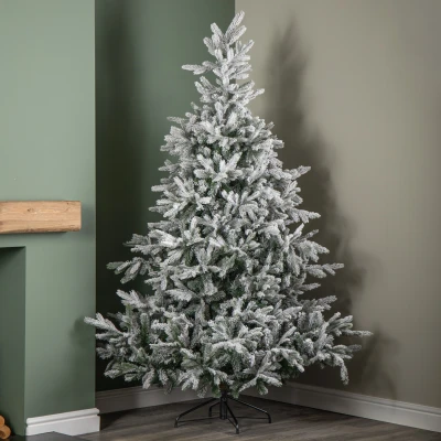 ManoManoCreate an enchanting winter wonderland in your home this festive season with this 7ft (2.1m) Tall Grandis Fir Snowy Christmas Tree with Metal Stand. Expertly crafted to capture the timeless beauty of a real forest fir dusted in fresh snow, this exquisite artificial tree combines luxury, realism, and practicality in one elegant design. Standing 7ft (2.1m) tall with an impressive 150cm diameter at its widest point, this tree makes a stunning centrepiece for any room. Its Grandis fir style branches are meticulously designed with a snowy finish, giving the appearance of a tree freshly sprinkled with frost. Each branch features a mix of PE and PVC tips, 2,326, in total, which provide both fullness and a lifelike texture. The real needle effect look ensures that every detail mirrors the natural beauty of genuine fir foliage. The hinged branch structure makes assembly simple and efficient. The tree comes in three easy to connect sections, allowing for quick setup and effortless storage once