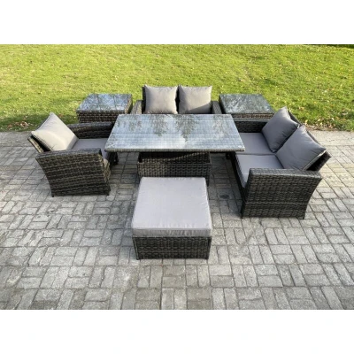 7pcs Rattan Outdoor Garden Furniture Set Height Adjustable Rising Lifting Table Sofa Dining with 2 Side Tables Big Footstool Dark Grey Mixed