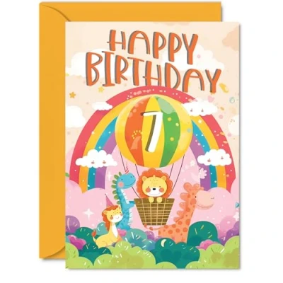 7th Birthday Card Girls Boys Hot Air Balloon Rainbow Happy for 7 Year Old Girl Boy Kids, A5 Seven Seventh Bday Animal Greeting Cards