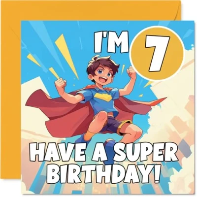 MAKE HIM SMILE WITH THIS UNIQUE BIRTHDAY CARD: This exceptional quality birthday card for him shows the design 'Im 7 Have a Super Birthday'. If you are looking for special birthday greetings cards for Boys birthday card then then this happy birthday card is bound to make him smile. Not just for birthday gifts for Boys this could also be for Great Nephew, Brother, Son, Godson, Step Son, Nephew, Cousin or Grandson. WHAT DO YOU GET: The card is printed on one side and BLANK ON THE INSIDE to allow you to write your very own message. The unique fun design is printed on a specially sourced and environmentally responsible board. At 360 microns thick the natural white one-sided gloss board has a quality look and feel. Supplied with a coloured gummed envelope to complement the design and ready to be sealed and sent in the post. Great Great Nephew birthday cards, 7th birthday card, Brother birthday card. NO INK SMUDGES: There is nothing worse than writing inside a card to find that the shiny surface makes the ink smudge. This is why we use a high quality one sided coated board. The uncoated side will absorb more of the ink from your pen to make smudging a thing of the past. 7th Birthday card for Son, 7th Birthday card for Godson, 7th Birthday card for Step Son. SIZES: Greeting Card = 145mm x 145mm, Envelope = 155mm x 155mm, Card Thickness = 360 micron. Nephew 7th birthday card, birthday cards for Cousin, cute birthday cards for Grandson, 7th birthday card Great Nephew, Brother 7th birthday card. MADE AND QUALITY CHECKED IN THE UK: We print and manufacture all our products right here in the UK so you can be sure of a fast turnaround and a product that is expertly made. Using environmentally responsible premium board our card is conscious of the responsible management of the world's forests - perfect birthday cards for Boys, fun birthday cards for him, Brother 7th birthday cards, female birthday cards.