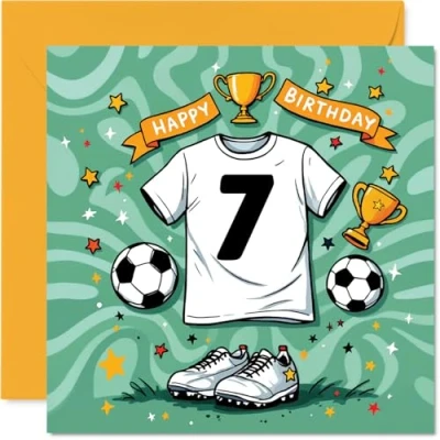 7th Birthday Cards for Boys Girls Football Shirt Happy Card 7 Year Old Boy Girl Cousin Daughter Grandson Son, 145mm Bday Greeting