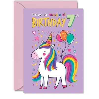 MAKE THEM SMILE WITH THIS UNIQUE BIRTHDAY CARD: This exceptional quality birthday card for him or her shows the design 'Have a Magical 7th Birthday'. If you are looking for special birthday greetings cards for Boys birthday card then then this happy birthday card is bound to make them smile. Not just for birthday gifts for Boys this could also be for Son, Grandson, Cousin, Daughter, Nephew, Sister, Granddaughter or Brother. WHAT DO YOU GET: The cards are printed on both sides with the inside print saying 'Youre so Uni-Cool!' and ample space for your own personal message. The unique fun design is printed on a specially sourced and environmentally responsible board. At 360 microns thick the natural white one-sided gloss board has a quality look and feel. Supplied with a coloured gummed envelope to complement the design and ready to be sealed and sent in the post. NO INK SMUDGES: There is nothing worse than writing inside a card to find that the shiny surface makes the ink smudge. This is why we use a high quality one sided coated board. The uncoated side will absorb more of the ink from your pen to make smudging a thing of the past. 7th Birthday card for Cousin, 7th Birthday card for Daughter, 7th Birthday card for Nephew. SIZES: Greeting Card = 127mm x 178mm, Envelope = 130mm x 180mm, Card Thickness = 360 micron. Sister 7th birthday card, birthday cards for Granddaughter, special birthday cards for Brother, 7th birthday card Son, Grandson 7th birthday card. MADE AND QUALITY CHECKED IN THE UK: We print and manufacture all our products right here in the UK so you can be sure of a fast turnaround and a product that is expertly made. Using environmentally responsible premium board our card is conscious of the responsible management of the world's forests - perfect birthday cards for Boys, fun birthday cards for him, Grandson 7th birthday cards, female birthday cards.