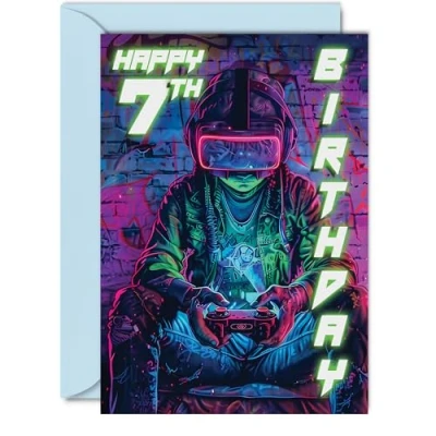 7th Birthday Cards for Boys Girls Video Game Gamer Happy 7 Card Son Daughter Nephew Niece Grandson, 5x7 Inch Seven Seventh Bday Greeting