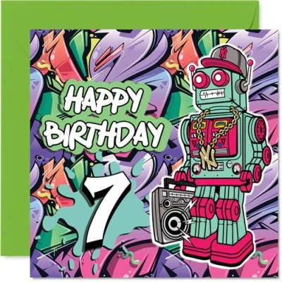 7th Birthday Cards for Boys Wicked Graffiti Robot Happy Card 7 Year Old Boy Nephew Son Great Cousin, 145mm Bday Greeting