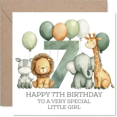 7th Birthday Cards for Girls Jungle Numbers Happy Card 7 Year Old Girl Granddaughter Step Daughter Great Niece Niece, 145mm Bday Greeting