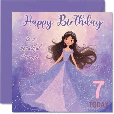 7th Birthday Cards for Girls Princess in Purple Happy Card 7 Year Old Girl Granddaughter Step Daughter Great Niece Niece, 145mm Bday Greeting