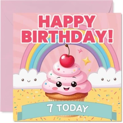 7th Birthday Cards for Girls Rainbow Cupcake Fairy Cake Happy Card 7 Year Old Girl Cousin Sister Niece Goddaughter, 145mm Bday Greeting