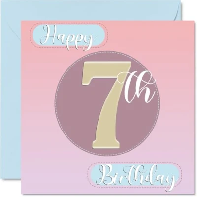 MAKE HER SMILE WITH THIS UNIQUE BIRTHDAY CARD: This exceptional quality birthday card for her shows the design 'Happy 7th Birthday'. If you are looking for special birthday greetings cards for Girls birthday card then then this happy birthday card is bound to make her smile. Not just for birthday gifts for Girls this could also be for Cousin, Daughter, Granddaughter, Niece, Sister, Goddaughter, Step Daughter or Great Niece. WHAT DO YOU GET: The card is printed on one side and BLANK ON THE INSIDE to allow you to write your very own message. The unique fun design is printed on a specially sourced and environmentally responsible board. At 360 microns thick the natural white one-sided gloss board has a quality look and feel. Supplied with a coloured gummed envelope to complement the design and ready to be sealed and sent in the post. Great Cousin birthday cards, 7th birthday card, Daughter birthday card. NO INK SMUDGES: There is nothing worse than writing inside a card to find that the shiny surface makes the ink smudge. This is why we use a high quality one sided coated board. The uncoated side will absorb more of the ink from your pen to make smudging a thing of the past. 7th Birthday card for Granddaughter, 7th Birthday card for Niece, 7th Birthday card for Sister. SIZES: Greeting Card = 145mm x 145mm, Envelope = 155mm x 155mm, Card Thickness = 360 micron. Goddaughter 7th birthday card, birthday cards for Step Daughter, cute birthday cards for Great Niece, 7th birthday card Cousin, Daughter 7th birthday card. MADE AND QUALITY CHECKED IN THE UK: We print and manufacture all our products right here in the UK so you can be sure of a fast turnaround and a product that is expertly made. Using environmentally responsible premium board our card is conscious of the responsible management of the world's forests - perfect birthday cards for Girls, fun birthday cards for her, Daughter 7th birthday cards, female birthday cards.
